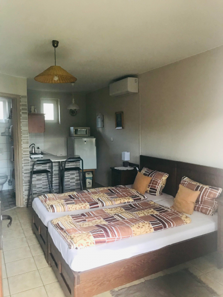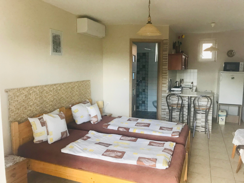 A ház hátsó felében található 3 db, a tornácról nyíló, egyenként 21 m2-es (különbejáratú) apartman, összesen 6 fő részére+2 fő (pótágyon). Mindegyik apartman felszerelt konyhával, zuhanyzóval. Vendégeink részére biztosítva van: ágynemű, törölköző, kenyérpirító, kávéfőző, teafőző, villanyrezsó, mikró, hűtő, kábel tv. INGYENES WIFI HASZNÁLAT!